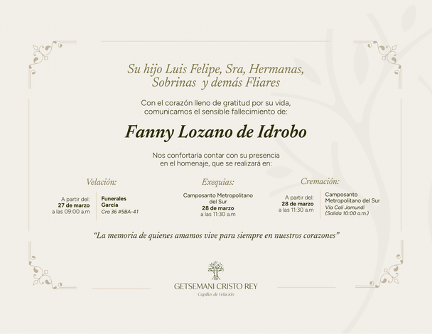 Consulta la información del Homenaje® de tu ser amado: el horario, la sala y Casa donde se está realizando. Contamos con la opción de entregar el arreglo floral o un servicio de cafetería directamente a la sala; solo necesitas seleccionar la opción que prefieras. También podrás compartir el obituario con las personas que deseas que te acompañen.